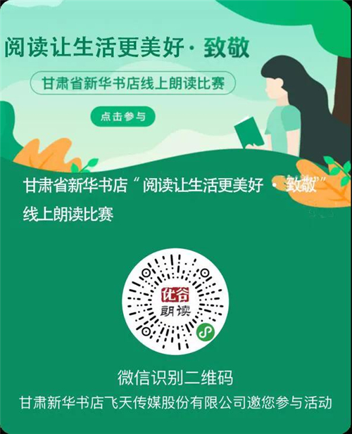 讀者進(jìn)入“甘肅新華書(shū)店飛天傳媒”公眾號(hào)點(diǎn)擊“新華朗讀”進(jìn)入小程序后,點(diǎn)擊頂部的“閱讀讓生活更美好?致敬”活動(dòng)圖,進(jìn)入活動(dòng)專(zhuān)區(qū),即可參加朗讀。