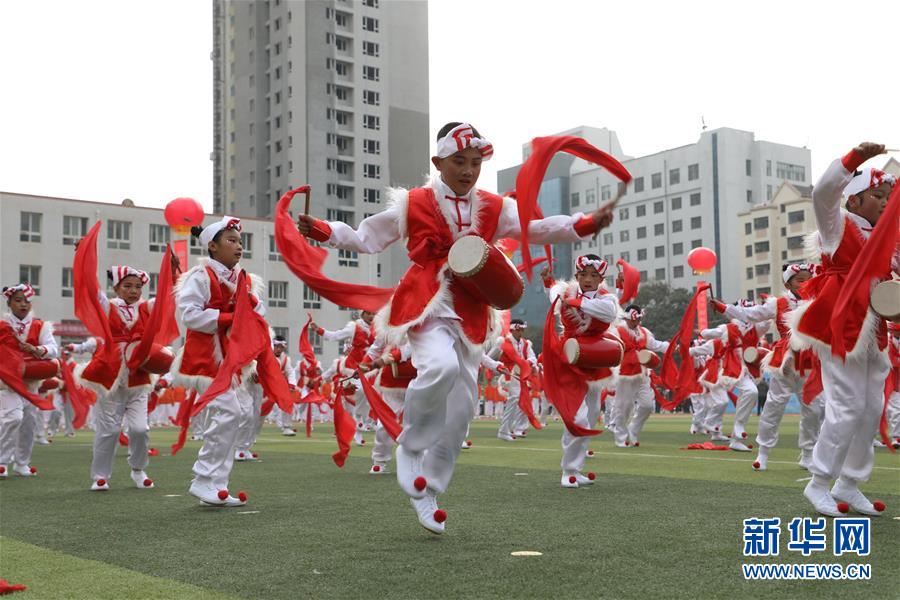 11月4日,蘭州市桃樹坪小學學生在活動現(xiàn)場表演歡慶腰鼓。當日,甘肅省蘭州市城關區(qū)學校體育“一校一品”現(xiàn)場展示活動在蘭州市第五十四中學舉行,16所學校進行了特色校園體育項目表演。據(jù)介紹,蘭州市城關區(qū)現(xiàn)已推廣各類體育項目40余項,命名“體育特色項目示范校”42所。 新華社記者 張智敏 攝