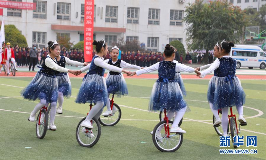 11月4日,蘭州市伏龍坪小學學生在活動現(xiàn)場進行獨輪車表演。新華社記者 張智敏 攝