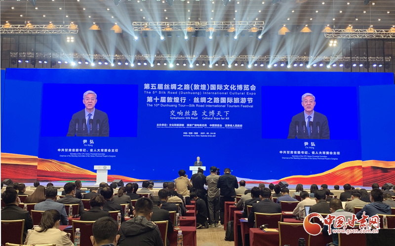 中國(guó)甘肅網(wǎng)9月24日訊(本網(wǎng)記者  宋芳科 楊亞楠 張振國(guó))9月24日上午,第五屆絲綢之路(敦煌)國(guó)際文化博覽會(huì)和第十屆敦煌行·絲綢之路國(guó)際旅游節(jié)開(kāi)幕。本屆“一會(huì)一節(jié)”由文化和旅游部、國(guó)家廣播電視總局、中國(guó)國(guó)際貿(mào)易促進(jìn)委員會(huì)、甘肅省人民政府共同主辦,以“交響絲路 文博天下”為主題,旨在進(jìn)一步加強(qiáng)“一帶一路”人文交流的官方合作和民間往來(lái),增進(jìn)共建“一帶一路”國(guó)家的文化認(rèn)同。中共中央政治局委員、中央書記處書記、中宣部部長(zhǎng)黃坤明以視頻方式發(fā)表主旨演講。