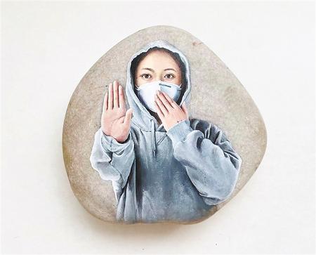 現(xiàn)在,馬玉蘭已完全掌握了“石畫”的技巧,跟隨石頭的形狀走勢設計畫面,利用凸出的部分打造光澤感,落筆時精準控制力度,她將疫情之下平凡人的神韻生動地體現(xiàn)在每一次運筆中。