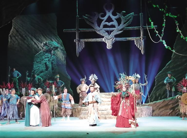 第三個(gè)步驟是大禹與土著山民首領(lǐng)山戎在強(qiáng)烈戲劇沖突中果斷地在改變自己的行為,并且以“忘我”的犧牲精神求得“天地之和,和在心中”的主旨意義。任何對(duì)自然生態(tài)的態(tài)度和沖突到頭來都集中體現(xiàn)在“人與人”的觀念習(xí)俗情仇恩怨的激烈紛爭(zhēng)之中。是故治水,也要“治理”自己的行為,升化自己的心智,以自己的真情坦露大愛, 甚或犧牲自己的性命。這就是“戲”的魅力。