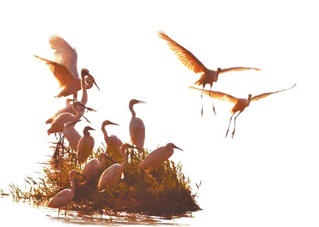 去年12月底,一位老師來西峰講學(xué),我陪先生到濕地海綿公園轉(zhuǎn)悠,剛剛步入人行道,發(fā)現(xiàn)遠處湖水中央有七八只白鷺在棲息,朝陽斜射到湖面上,水波瀲滟,像細(xì)碎的金斑,白鷺安詳?shù)叵礈熘鹈?,有一只白鷺單腿直立著,恰似依著一根筆直纖細(xì)的鐵絲,半張著翅膀,欲飛不飛的樣子,剩下的幾只白鷺在戲水,迷人極了。