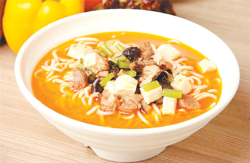 西峰的臊子面也很有地方特色,因其太辣,吃在嘴里不斷發(fā)出噓噓哨聲,故又稱“哨子面”。西峰臊子面制作獨特,吃法有趣,堪稱一絕。正如一首民歌唱到“十八省里(那個)轉(zhuǎn)一遍,好不過咱們西峰的臊子面”。西峰臊子面做工精細(xì),制作分揉面、搟面、做湯、煮面幾個工序:“抻的面銀團團,搟的面紙一般,剁的面千條線,下到鍋里蓮花轉(zhuǎn),撈到筷子上打秋千,盛到碗里賽牡丹。”做成的臊子面條長如線,細(xì)如絲,長而柔韌,細(xì)而不斷,噴香美味,別具風(fēng)味。