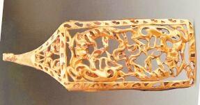 受草原文化影響,虎的造型更具藝術(shù)性,形式亦豐富多彩。甘肅省博物館藏的西周虎紋耳形銅鉞,整體似半環(huán),鑄猛虎紋,虎背為刃。尾下有短胡兩穿,尾、雙爪上鑄凹槽,虎首下彎,張口含銎,露牙睜目,領(lǐng)內(nèi)有一圓形穿孔。甘肅省文物考古研究所藏的戰(zhàn)國(guó)金帶鉤,鉤首為長(zhǎng)頸龍首狀,頸部為三棱狀,肩部三角形邊框內(nèi)鏤空雕鑄對(duì)稱和狼形圖案。鉤身為長(zhǎng)方形,邊框內(nèi)鏤空雕刻一組正反相對(duì)稱的虎噬大角羊圖案。張家川回族自治縣博物館藏的戰(zhàn)國(guó)晚期的虎形金飾片,虎尖耳上翹,大嘴張開,鬃毛卷曲上翹,尾前卷于背部與鬃毛相連,四足著地做行走狀,栩栩如生地展現(xiàn)了虎行走的動(dòng)感之態(tài)。甘肅省博物館藏的戰(zhàn)國(guó)虎噬羊紋金飾片,虎張口露齒,垂首蹲踞,虎口銜羊,前爪按住羊肩部,后爪抓住羊臀部,羊四肢跪地作掙扎狀,活靈活現(xiàn)地展現(xiàn)出猛虎捕食羊的瞬間動(dòng)態(tài),形象逼真。這些虎文物都是此次展覽中的亮點(diǎn)。