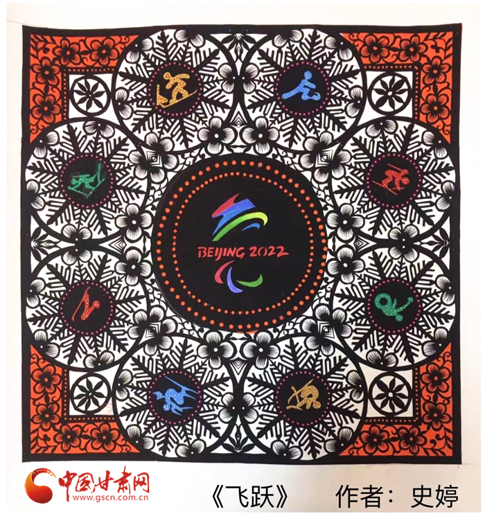“剪紙是中國(guó)傳統(tǒng)文化,也是我的特長(zhǎng),所以我就用剪紙的形式創(chuàng)作了這兩幅《冬夢(mèng)》《飛躍》”。時(shí)值冬奧會(huì)在北京盛大開幕,史婷以冬奧會(huì)和冬殘奧會(huì)的會(huì)微為主題,加上一些比賽項(xiàng)目的標(biāo)志,創(chuàng)作了兩幅剪紙藝術(shù)作品。“我想通過(guò)作品為奧運(yùn)健兒們加油助力,希望他們?cè)诒荣愔心苋〉酶玫某煽?jī)。”她說(shuō)。