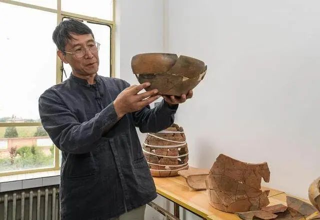 南佐遺址聯(lián)合考古隊(duì)領(lǐng)隊(duì)、中國(guó)人民大學(xué)歷史學(xué)院考古文博系教授韓建業(yè)在遺址研究基地內(nèi)展示出土的陶器(8月23日攝)。新華社記者 李賀 攝