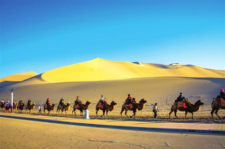 鳴沙山·月牙泉景區(qū)游客騎乘駱駝。 謝沛宏