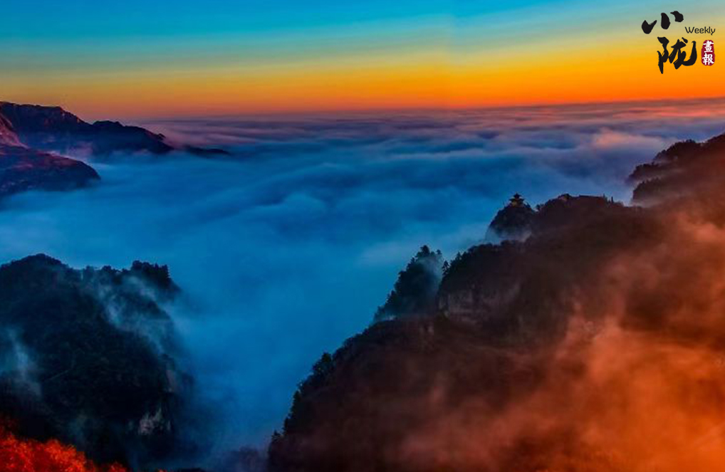 雪霽,登臨崆峒,望旭日東升,彩霞映紅山間,云霧隨風(fēng)翻滾,像云彩縹緲,纏繞在山腰之間,彌漫開來,又如一條仙女的白絲帶……絢麗而有詩意。