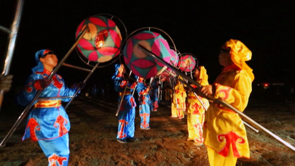 景泰滾燈由燈籠和燈架組成,燈籠分里外兩層,為圓形,外層轉動內層固定,燈籠外層用彩紙或紗綢裱糊。表演者手執(zhí)燈架,輕輕一碰地面,燈籠便轉動起來。夜晚,彩燈滾動,猶若五彩斑斕的長龍,扭曲躍動,時慢時快,回頭擺尾往復盤旋,交響輝映,別有一番情趣。