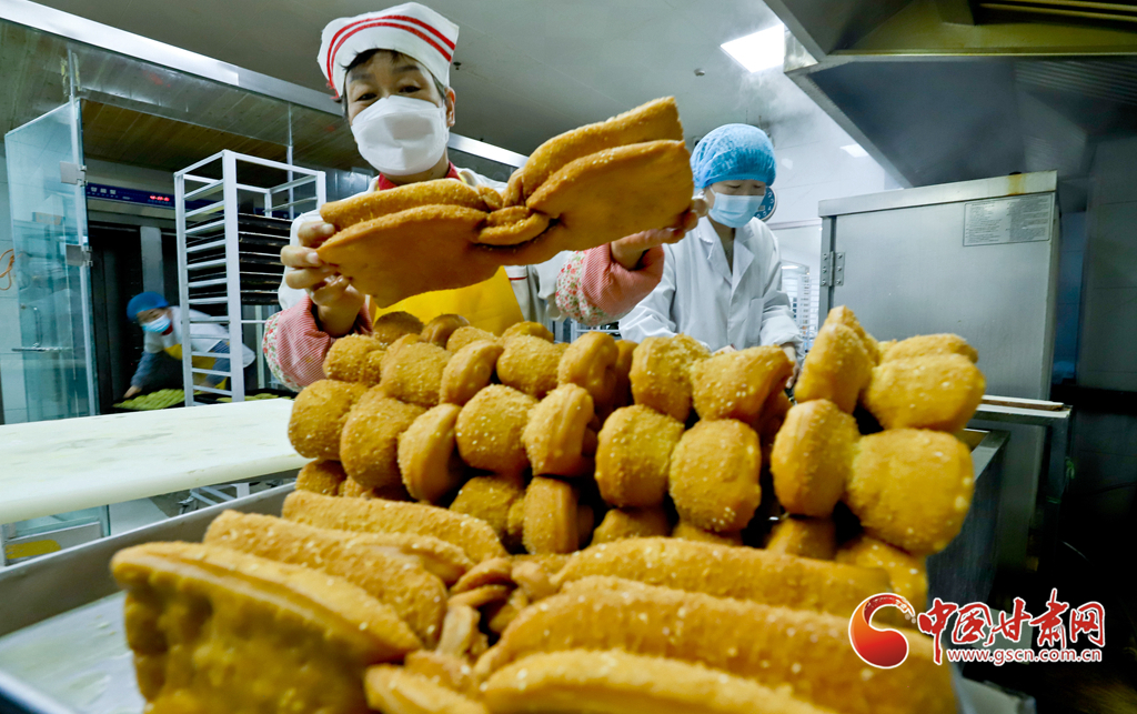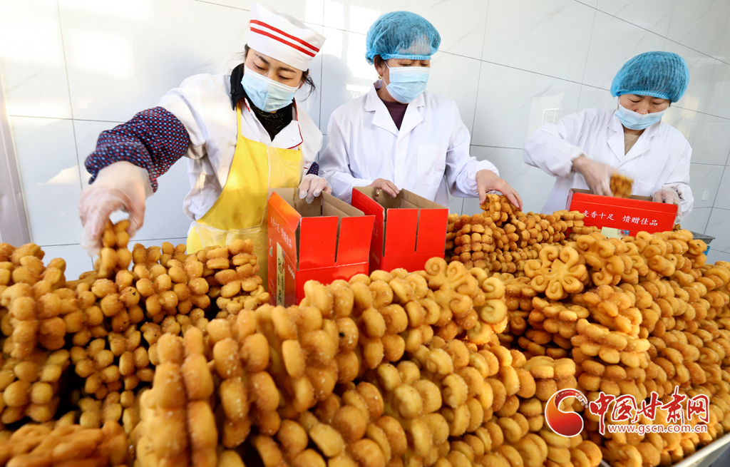 1月10日,在張掖市山丹縣一饃饃制作車間里,工作人員正在制作“糖花子”。