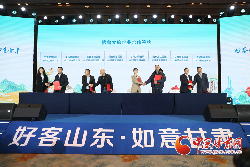定西、隴南兩市文化廣電和旅游局分別與青島市文化和旅游局簽訂《戰(zhàn)略合作協(xié)議》,甘肅保利國際旅行社與青島好客五洲國際旅行社等兩地8家文旅企業(yè)(旅行社)代表分別簽訂了《“好客山東·如意甘肅”雙向游市場化客源互送合作協(xié)議》。