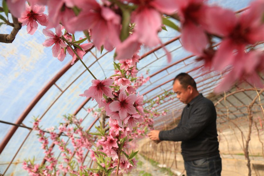 農(nóng)民在溫室中為桃樹疏花。張曉亮攝