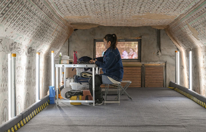 2023年8月3日,在敦煌莫高窟正在保護修繕的第55窟內(nèi),一位文保工作者對采集的數(shù)據(jù)進行整理。新華每日電訊記者 李賀 攝