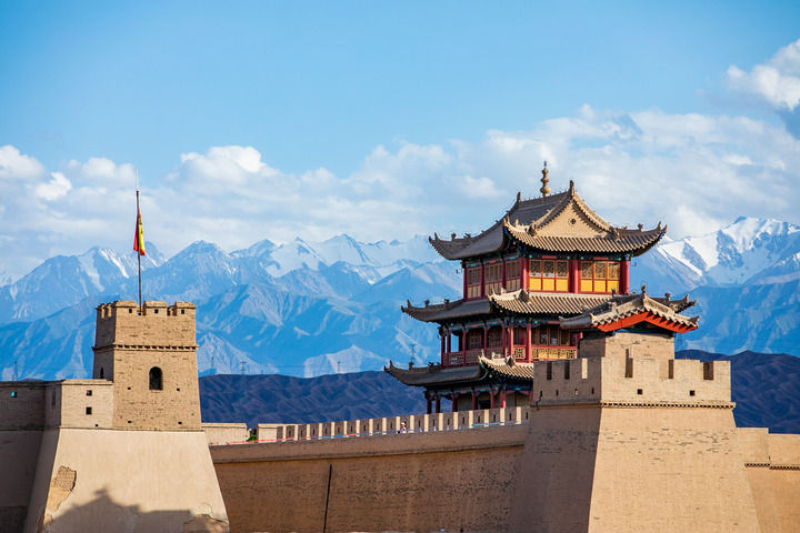 這是2023年7月19日拍攝的祁連雪山與嘉峪關關城。 新華社每日電訊記者 朗兵兵 攝