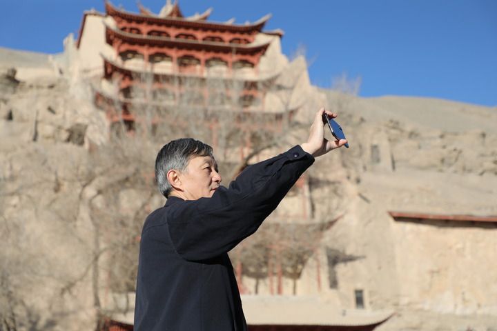 2022年2月23日,敦煌研究院院長蘇伯民正在用手機進行“數(shù)字敦煌”體驗。 新華每日電訊記者 張睿 攝