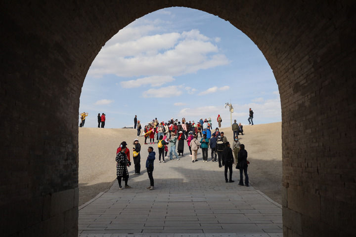 2023年9月11日,游客在甘肅省敦煌市鳴沙山月牙泉景區(qū)游覽。新華社發(fā)(張曉亮 攝)