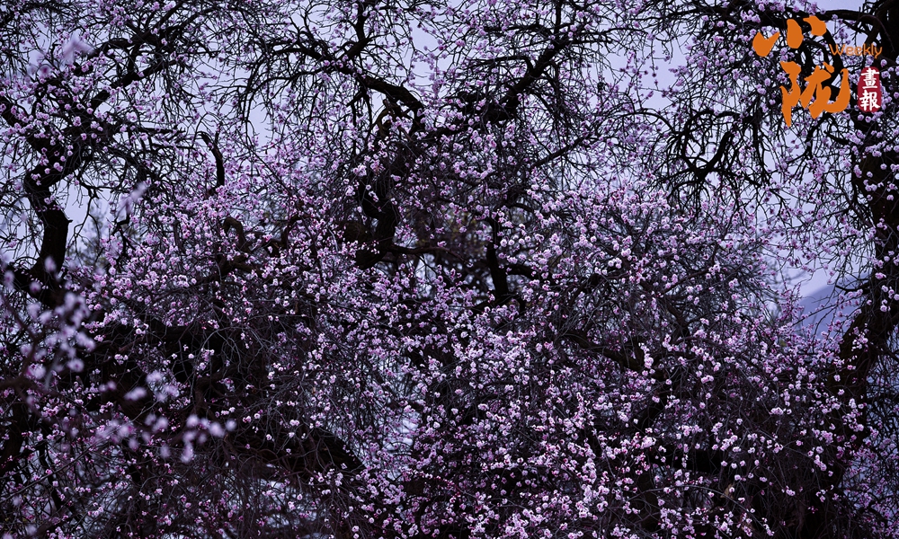 大面積杏樹應(yīng)季綻放,將一片片大地披上春天的“盛裝”,紫色的杏花,為大地寫滿了詩(shī)行,編織出一幅美麗的鄉(xiāng)村畫卷。