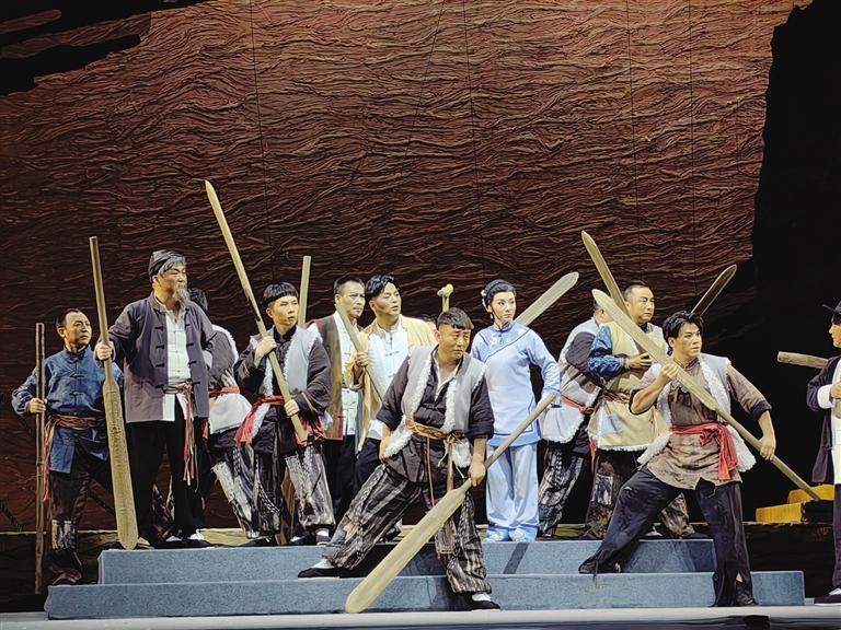 中國甘肅網(wǎng)5月21日訊 據(jù)蘭州晚報報道(記者 高宏梅 文/圖)酣暢淋漓的“花兒”唱出了黃河兒女的人間悲喜,韻味濃厚的“嘛簧”一唱眾幫,隴劇戲曲張力無限,“羊皮筏子賽軍艦”的熱血故事成就走心之作……5月19日晚,國家藝術(shù)基金資助項目原創(chuàng)隴劇《大河?xùn)|流》在黃河劇院成功首演,隴劇“梅花獎”甘當(dāng)配角,“青春力量”首挑大梁,出新出彩的優(yōu)異表現(xiàn)贏得滿堂彩。