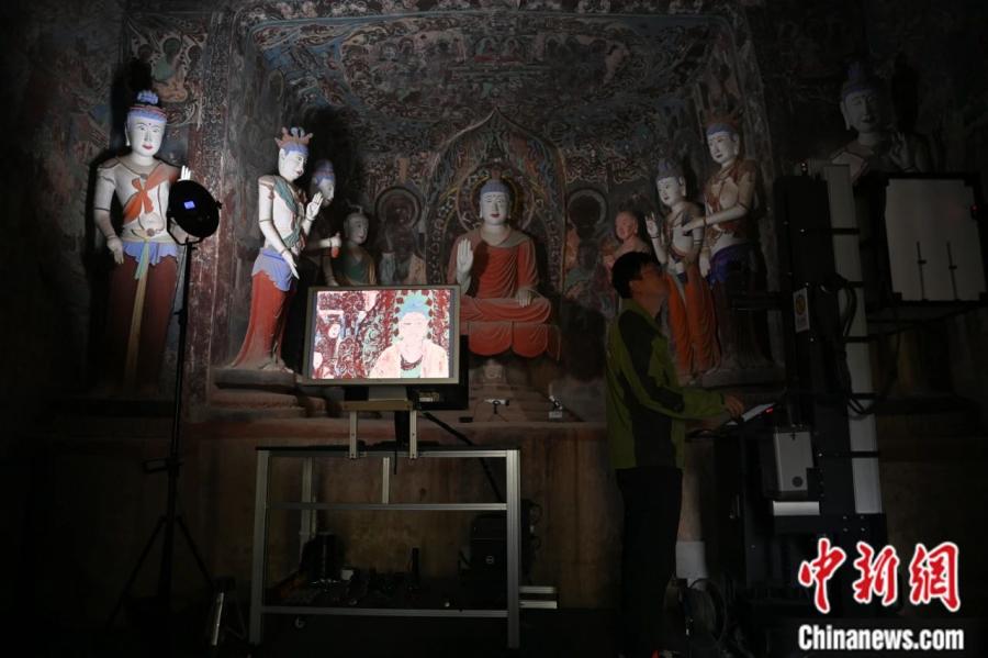 2024年6月,甘肅敦煌莫高窟內(nèi),敦煌研究院文物數(shù)字化研究所工作人員進(jìn)行敦煌壁畫數(shù)字化采集工作。李亞龍 攝