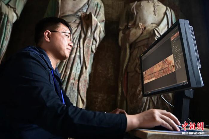 甘肅天水,工作人員在麥積山石窟內(nèi)檢查數(shù)字化掃描的造像和壁畫(huà)信息。九美旦增 攝