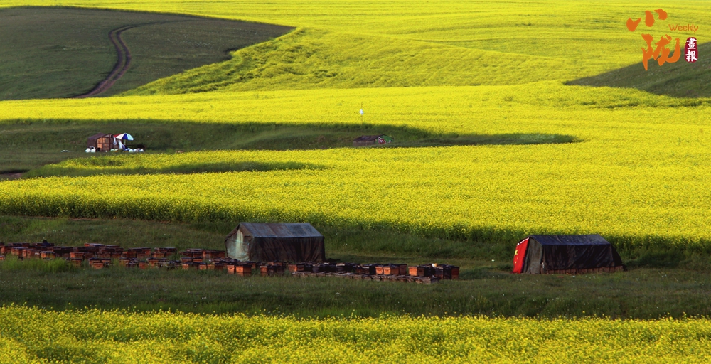 千里沃野,深淺各異、層疊的綠色,又有萬頃油菜花鋪天蓋地,連綿起伏,在夏日驕陽的照耀下,鋪展成光芒四射、一望無際的黃金地毯。