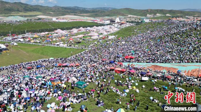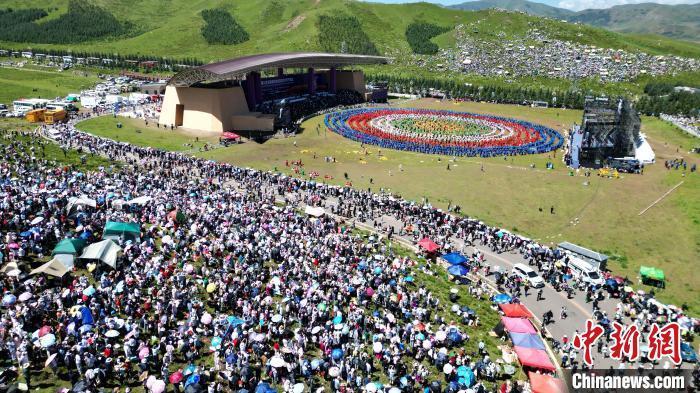 8月4日,人們在當(dāng)周草原觀看九色甘南香巴拉旅游藝術(shù)節(jié)開幕式表演。當(dāng)日,第22屆九色甘南香巴拉旅游藝術(shù)節(jié)在甘肅省甘南藏族自治州當(dāng)周草原開幕。人們身著節(jié)日盛裝載歌載舞、歡聚一堂,馬隊巡游、千人鍋莊舞等活動精彩上演。九色甘南香巴拉旅游藝術(shù)節(jié)既是民眾浪山聚會的節(jié)日盛會,也是展現(xiàn)發(fā)展成就、擴(kuò)大對外開放的重要窗口,更是展示民俗文化、促進(jìn)廣泛交往交流交融的有效載體。(無人機(jī)照片)中新社記者 九美旦增 攝