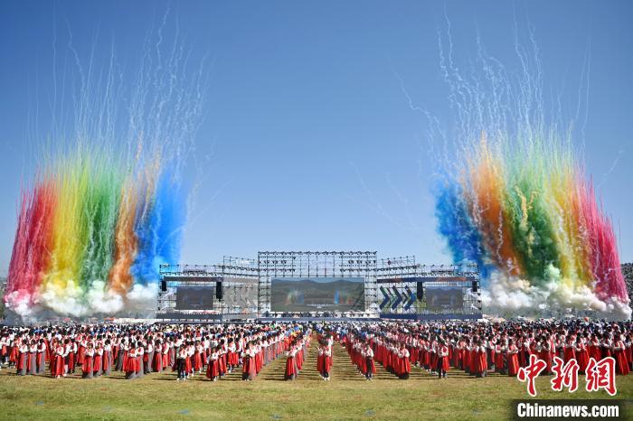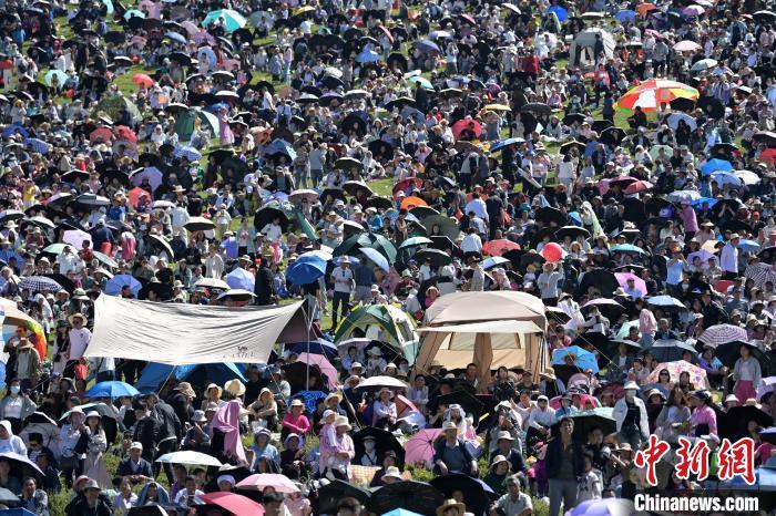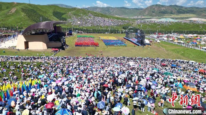 8月4日,第22屆九色甘南香巴拉旅游藝術(shù)節(jié)在甘肅省甘南藏族自治州當(dāng)周草原開幕。人們身著節(jié)日盛裝載歌載舞、歡聚一堂,馬隊巡游、千人鍋莊舞等活動精彩上演。九色甘南香巴拉旅游藝術(shù)節(jié)既是民眾浪山聚會的節(jié)日盛會,也是展現(xiàn)發(fā)展成就、擴(kuò)大對外開放的重要窗口,更是展示民俗文化、促進(jìn)廣泛交往交流交融的有效載體。圖為開幕式現(xiàn)場。中新社記者 九美旦增 攝