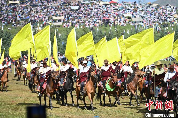 8月4日,藏族騎手在當(dāng)周草原上表演馬隊巡游。當(dāng)日,第22屆九色甘南香巴拉旅游藝術(shù)節(jié)在甘肅省甘南藏族自治州當(dāng)周草原開幕。人們身著節(jié)日盛裝載歌載舞、歡聚一堂,馬隊巡游、千人鍋莊舞等活動精彩上演。九色甘南香巴拉旅游藝術(shù)節(jié)既是民眾浪山聚會的節(jié)日盛會,也是展現(xiàn)發(fā)展成就、擴(kuò)大對外開放的重要窗口,更是展示民俗文化、促進(jìn)廣泛交往交流交融的有效載體。中新社記者 九美旦增 攝