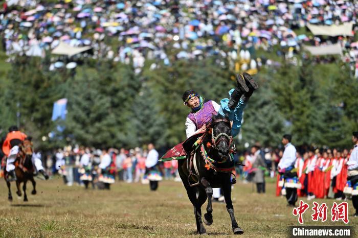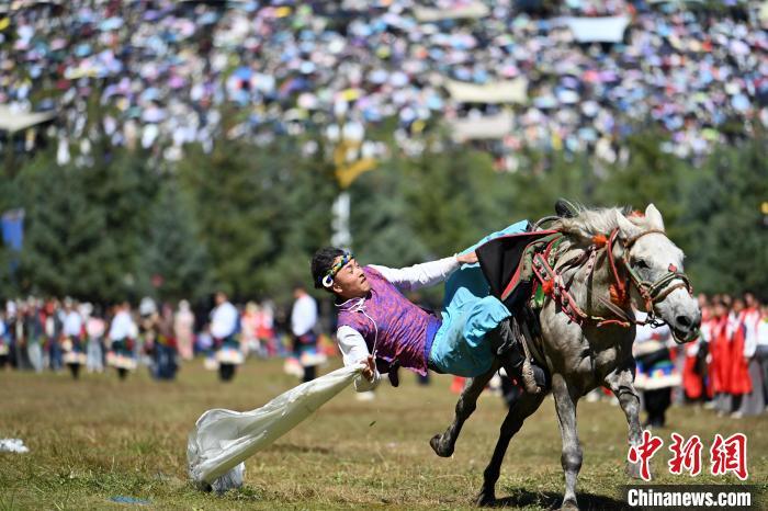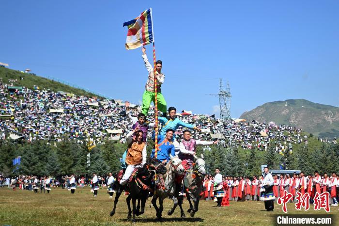 8月4日,藏族騎手在當(dāng)周草原上表演馬術(shù)。當(dāng)日,第22屆九色甘南香巴拉旅游藝術(shù)節(jié)在甘肅省甘南藏族自治州當(dāng)周草原開幕。人們身著節(jié)日盛裝載歌載舞、歡聚一堂,馬隊巡游、千人鍋莊舞等活動精彩上演。九色甘南香巴拉旅游藝術(shù)節(jié)既是民眾浪山聚會的節(jié)日盛會,也是展現(xiàn)發(fā)展成就、擴(kuò)大對外開放的重要窗口,更是展示民俗文化、促進(jìn)廣泛交往交流交融的有效載體。中新社記者 九美旦增 攝