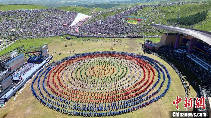 8月4日,第22屆九色甘南香巴拉旅游藝術(shù)節(jié)在甘肅省甘南藏族自治州當(dāng)周草原開幕。人們身著節(jié)日盛裝載歌載舞、歡聚一堂,馬隊巡游、千人鍋莊舞等活動精彩上演。九色甘南香巴拉旅游藝術(shù)節(jié)既是民眾浪山聚會的節(jié)日盛會,也是展現(xiàn)發(fā)展成就、擴(kuò)大對外開放的重要窗口,更是展示民俗文化、促進(jìn)廣泛交往交流交融的有效載體。圖為開幕式現(xiàn)場千人鍋莊舞表演。(無人機(jī)照片)中新社記者 九美旦增 攝