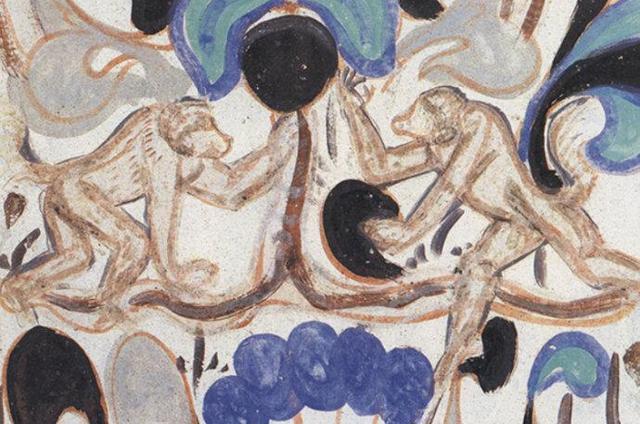 在這一壁畫中共畫了五只猴子,其中有兩只猴子在有摩尼寶珠的蓮花下面玩耍,猴子尾巴高高翹起,尖嘴大臉,似乎在用手攀折蓮枝,畫面構圖簡練生動。