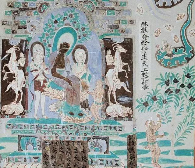 壁畫畫面右側有一飛天正在散花,云端之下是一棵茂盛的大樹,一只猴子正仰著頭,一手舉起做采摘狀。其旁側有白底墨書題記寫著“獼猴命終得生天上散花供養(yǎng)”。畫面右側一佛坐蓮花座之上,兩旁一弟子一菩薩協(xié)侍左右,一只猴子雙手捧一缽,虔誠地供養(yǎng)佛。