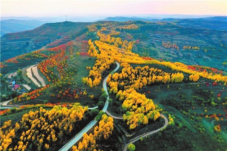 金秋時(shí)節(jié),這里秋葉五彩繽紛,黃得如金,綠得如玉,紅得如火,把秋姑娘打扮得格外妖嬈。一陣涼風(fēng)拂過(guò),金黃的樹(shù)葉,搖曳著一把把小扇子,從空中飄飄而下,似乎在訴說(shuō)著一個(gè)美麗的童話。村落散落在綿延數(shù)里的山腳下,村前屋后金色圍繞,梯田如鏈似帶、穿插交錯(cuò),如一幅幅線條簡(jiǎn)潔明快的木刻版畫。