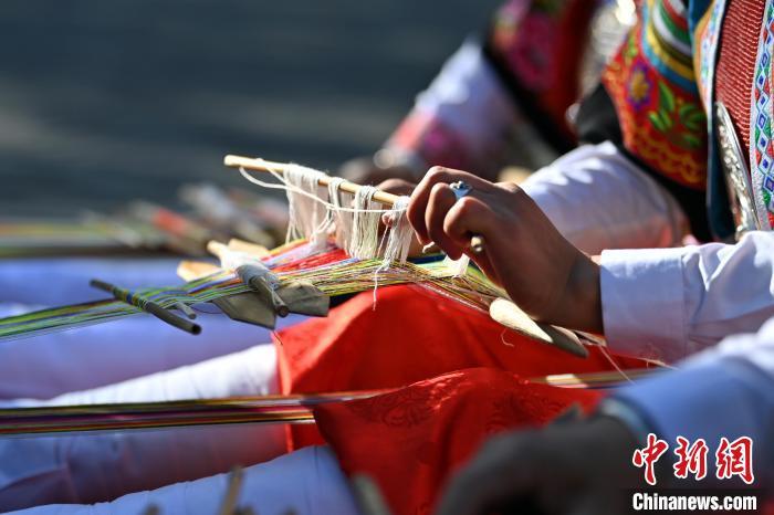 9月26日,甘肅省甘南藏族自治州舟曲縣,當(dāng)?shù)夭刈鍕D女紡織錦帶。錦帶是舟曲藏族婦女用以束腰、扎靴、攏發(fā)乃至點(diǎn)綴服飾的花帶子,艷麗多彩、圖案優(yōu)美。每逢吉慶節(jié)日,藏族婦女穿戴的華麗盛裝就需要少則五、六條,多則十幾條寬窄長短相宜的錦帶來裝飾。據(jù)介紹,藏族織錦帶技藝歷史悠久,一千多年以前,古羌族和吐蕃已有了較發(fā)達(dá)的手工編織技術(shù),在艱難的生活條件下對服飾等生活用品除實(shí)用功能之外,已經(jīng)有了強(qiáng)烈的審美追求,是研究舟曲羌藏文化的“活化石”。中新社記者 九美旦增 攝