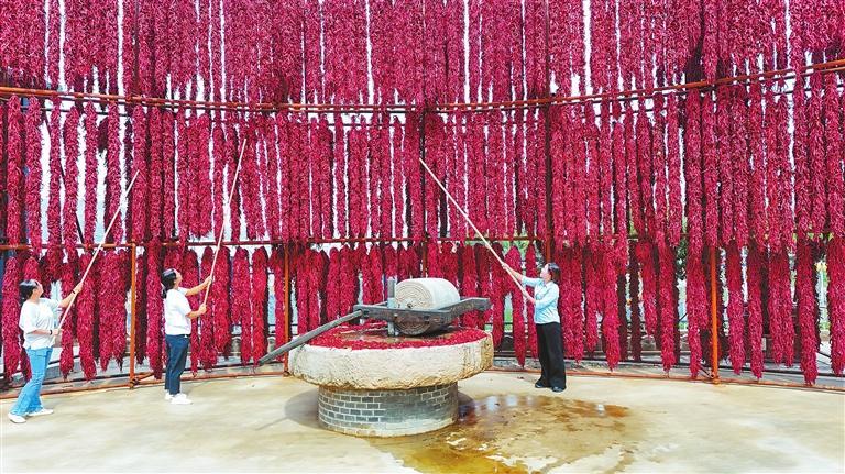 位于甘谷縣安遠(yuǎn)鎮(zhèn)上河灣村的甘肅隴上椒農(nóng)業(yè)科技(集團(tuán))有限公司,工作人員正在晾曬辣椒。新甘肅·甘肅日?qǐng)?bào)通訊員 王啟寧
