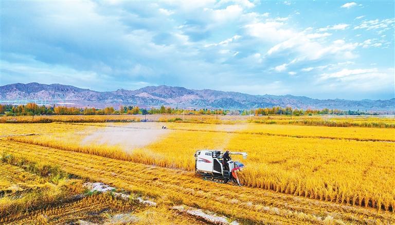 張掖市甘州區(qū)烏江鎮(zhèn)大灣村2000多畝稻田一片金黃,村民正在進(jìn)行搶收作業(yè)。新甘肅·甘肅日?qǐng)?bào)通訊員 楊瀟