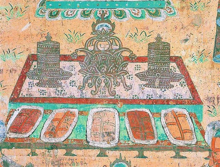 宋朝詩人陸游在《食粥》一詩中寫道:“世人個個學(xué)長年,不悟長年在目前。我得宛丘平易法,只將食粥致神仙。”意思是說人人都期盼長壽,怎么也沒有想到,我就成了長壽之人。如果讓我總結(jié)一下我長壽的秘訣,那就是我喝的粥多而已。想想冬天到了,天寒地凍,喝碗粥,渾身上下暖烘烘的多美啊??墒窃诙鼗捅诋嬂?,人們在冬季不是喝粥,而是喝熱牛奶。在莫高窟第146窟壁畫中有一幅“擠牛奶圖”:畫面上一頭健碩的母牛正在被人擠奶,它回首望向擠奶者。在它的身下,還有一只小牛犢正貪婪地望著擠奶者。兩頭牛都憨態(tài)可掬、萌蠢可愛。漫天飛雪中,煮沸的牛奶溫暖著漫長冬季的每時每刻。在莫高窟第302窟中有一幅“湯水浴圖”。湯水就是溫泉。畫面上在樹木掩映之下有一池溫泉,有一大一小兩個人正沉浸在溫泉沐浴的歡快之中??梢?,伴著紛飛的大雪泡個溫泉,不是只有今天才有的享受;在千年之前的敦煌,人們就已經(jīng)開始修建溫室浴池,而且引水排水的技術(shù)已經(jīng)較為完善。院落依依、親朋融融、池水湯湯、筋骨軟軟,逸興悠悠。
