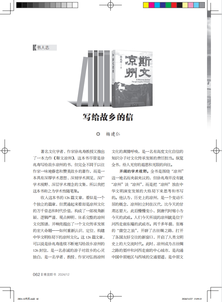 閱讀徐兆壽寫給故鄉(xiāng)的帶著滾燙體溫的126封信,總是給人一種澎湃的激情和磅礴的力量,總是讓人思接千載、視通萬(wàn)里。《斯文涼州》立足絲綢之路和中華文明的歷史格局,提出了重構(gòu)涼州文化的宏大愿望,讓讀者深刻認(rèn)識(shí)到,徐兆壽的故鄉(xiāng)涼州,不單單是他日夜眷戀的熱土,而是打破了行政區(qū)劃的大地理概念,更是中華民族共同的文化符號(hào)和精神歸宿。在建設(shè)中華民族現(xiàn)代文明的今天,我們應(yīng)當(dāng)全面了解、認(rèn)識(shí)、重構(gòu)涼州文化,真正做到創(chuàng)造性轉(zhuǎn)化、創(chuàng)新性發(fā)展。認(rèn)識(shí)了這本書的價(jià)值,也就認(rèn)識(shí)了作者的價(jià)值,徐兆壽不僅是一位優(yōu)秀的文化學(xué)者、教授、作家,而且也是一位有智慧、有見地的歷史學(xué)家。