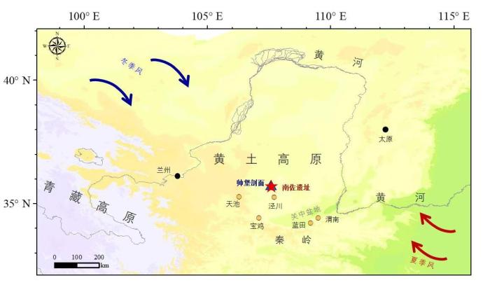 南佐遺址和帥堡剖面地理位置及所受季風影響示意圖。韓建業(yè) 供圖