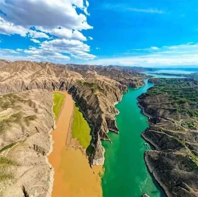 在永靖縣劉家峽大壩附近,黃河與洮河以“Y”字形交匯,形成了“黃洮交匯”的奇觀。黃河水清澈碧藍,而洮河則因攜帶大量泥沙呈現(xiàn)渾濁的黃色,兩者相遇卻不相融,形成了一條鮮明的分界線,宛如一幅天然的“鴛鴦鍋”畫卷。