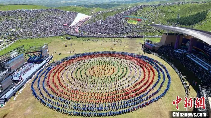 2024年8月4日,第22屆九色甘南香巴拉旅游藝術(shù)節(jié)在甘肅省甘南藏族自治州當(dāng)周草原開幕。圖為開幕式現(xiàn)場(chǎng)鍋莊舞表演。(資料圖)九美旦增 攝