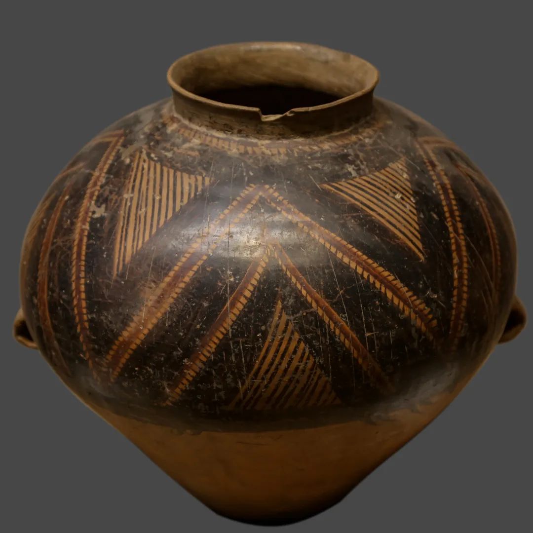 鋸齒紋由密集排列的三角形構(gòu)成,形似鋸齒,多作為主紋飾的邊緣裝飾帶。半山類型首創(chuàng),通過黑彩與陶胎本色形成對(duì)比,增強(qiáng)紋飾立體感,部分鋸齒紋邊緣刻劃細(xì)密凹痕,凸顯工藝精細(xì)化特征。