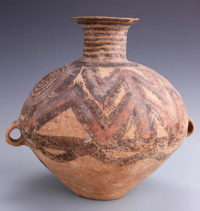 彩陶蛙紋壺,新石器時(shí)代馬家窯文化馬廠類型,高42厘米,口徑13.1厘米。壺泥質(zhì)紅陶,口外侈,薄唇,球形腹,小平底,腹部兩側(cè)對稱置雙系。于橙紅色陶衣上以黑彩描繪變形蛙紋。圖案線條流暢,富于變化,與造型協(xié)調(diào)一致。據(jù)科學(xué)測試,馬家窯文化馬廠類型彩陶的年代約為公元前2200~前2000年。變形蛙紋作為馬家窯文化馬廠類型彩陶上常見的裝飾紋樣之一,體現(xiàn)了遠(yuǎn)古人們對于繁衍生殖的渴望。青蛙產(chǎn)下許多卵,孵出許多蝌蚪,正是繁衍旺盛的象征。