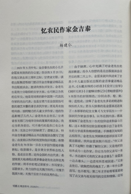 由于缺席,心中充滿了對金老先生的深深歉意。而令人欣慰的是在出版座談會召開后的第二天上午,金雷泉就向我送來了甘肅少年兒童出版社出版的金吉泰童話精品叢書,《頭戴水珠的小杉苗》《沒牙三弦琴》《銅環(huán)兄弟》《小蜜蜂偵察記》《青蛙借雷聲》5本圖書的封面顏色,分別由赤、橙、黃、綠、藍(lán)組成,詮釋了金老先生多彩的軌跡和繽紛的人生。更令人驚喜的是金雷泉還送來了一本厚厚的紀(jì)念文集《為文學(xué)而生——中國農(nóng)民作家金吉泰》,從書名到內(nèi)容,都高度凝練了金老先生一生的信仰追求和奮斗歷程,這6本圖書比較全面地展示出了金老先生的文學(xué)成果和精神圖譜。手捧著沉甸甸的這些圖書,金老先生笑瞇瞇的慈祥面容又浮現(xiàn)在眼前,我向金雷泉脫口而出:“你父親真了不起??!你最了解你父親,又是他把你培養(yǎng)成為一名作家,你應(yīng)當(dāng)為你父親寫一本書,書名就叫《我的父親金吉泰》。”金雷泉一邊點(diǎn)著頭,一邊若有所思地說道:“父親去世后,就像把我的魂丟了,第一年什么都沒寫,也不敢寫,第二年才開始零零星星地寫了點(diǎn)父親與有關(guān)報刊的交往和情緣,還寫了點(diǎn)父親在生活和寫作中的軼事趣聞。您的建議非常好,我擔(dān)心駕馭不好,試試看吧。”我感覺金雷泉有點(diǎn)為難,馬上又安慰他:“不急,你用兩三年時間慢慢寫。”
