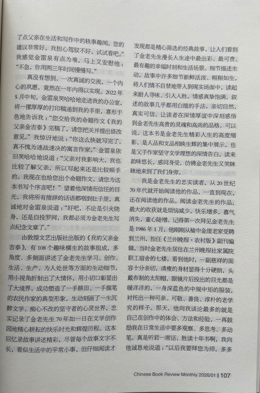 由敦煌文藝出版社出版的《我的父親金吉泰》,有108個趣味橫生的故事組成,多角度、多側(cè)面講述了金老先生學(xué)習(xí)、創(chuàng)作、生活、生產(chǎn)、為人處世等方面的生動細(xì)節(jié),用小視角折射出了大情懷,用小切口彰顯出了大境界,成功塑造了一手耕田、一手握筆的農(nóng)民作家的典型形象,生動刻畫了一生沉醉文學(xué)、癡心不改的堅(jiān)守者的心靈世界,忠實(shí)記錄了金老先生70年如一日在文學(xué)創(chuàng)作園地精心耕耘的快樂時光和輝煌歷程。這本回憶錄故事講述精彩,盡管每個故事文字不長,看似生活中的平常小事,但仔細(xì)閱讀才發(fā)現(xiàn)都是精心篩選的經(jīng)典故事,讓人們看到了金老先生漫長人生途中最出彩、最可貴、最有趣的幸福時刻和生活場景。細(xì)節(jié)描述生動,故事中許多細(xì)節(jié)新鮮活潑、栩栩如生,將人們情不自禁地帶入到現(xiàn)實(shí)場面中,讀起來耐人尋味、引人入勝。情感真摯飽滿,敘述的故事幾乎都用白描的手法,親切自然,真實(shí)可信,讓讀者在深情厚誼中深刻感悟到金老先生高貴的靈魂和高尚的品格??梢哉f,這本書是金老先生精彩人生的高度縮影,是人品和文品相映生輝的集中展示,也是父子作家堅(jiān)守文學(xué)理想的深情告白,讀來韻味悠長,感同身受,仿佛金老先生又笑瞇瞇地來到了我們身旁。