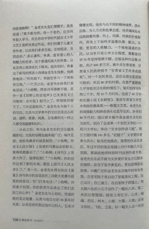 從此之后,我與金老先生的交往越來越密切,交流的話題也越來越廣泛,每次見面,他給我最多的就是鼓勵:“小楊啊,你在《人民日報》上發(fā)表的寫奧運(yùn)會的散文,看得我都激動了。”“小楊啊,《詩刊》上發(fā)表大作了,值得祝賀!”“小楊啊,你的創(chuàng)作達(dá)到了新的水準(zhǔn),都登上國刊《人民文學(xué)》了。”有一次,金老先生得知我在《星星》詩刊舉辦的首屆農(nóng)民工詩歌大獎賽中獲獎的消息后,專門打來電話:“小楊啊,向你表示祝賀,你的獲獎作品表達(dá)了我們農(nóng)民工的心聲!”金老先生與人相處,傳遞的絕對是正能量,從我與他交往的30多年時光里,從來沒有聽到過他非議別人。后來才慢慢發(fā)現(xiàn),他有與眾不同的精神境界、質(zhì)樸品格、為人方式和處事態(tài)度,他靈魂深處永遠(yuǎn)流淌著向善、向上、向真、向美的價值取向,渾身上下始終洋溢著執(zhí)著、豁達(dá)、樂觀、寬容的人格魅力。一個地地道道的農(nóng)民,從當(dāng)年只有小學(xué)文化程度,靠勤奮自學(xué)70年堅(jiān)持筆耕不輟,出版各種作品集25部,共計(jì)400多萬字,被中共甘肅省委、甘肅省人民政府授予“甘肅省文藝終身成就獎”。對一個農(nóng)民來說,這在全國也是屈指可數(shù)的。年近80歲的時候,在患嚴(yán)重眼疾幾乎導(dǎo)致雙目失明的情況下,每天堅(jiān)持寫作兩三千字,用10個月時間,完成了45萬字的長篇小說《農(nóng)耕圖》,榮獲甘肅省文學(xué)藝術(shù)類政府最高獎——敦煌文藝獎,金老先生的頑強(qiáng)毅力和拼命勁頭也是罕見的。20世紀(jì)80年代初,他以家鄉(xiāng)榆中縣金崖鄉(xiāng)文化站為依托,創(chuàng)辦了全省第一個農(nóng)民文學(xué)社——苑川文學(xué)社,舉辦“文學(xué)創(chuàng)作講習(xí)班”,吸引方圓村鎮(zhèn)100多名“泥腿子”文學(xué)愛好者參與其中,每當(dāng)經(jīng)他修改、推薦的作品發(fā)表后,年過半百的他總是騎上自行車跑幾十公里路,喜滋滋地將樣報樣刊送到作者手里,金老先生樂此不疲為文學(xué)愛好者全方位服務(wù)的情懷,在當(dāng)下是不多見的,更加顯得彌足珍貴。興趣廣泛的金老先生在晚年時突發(fā)奇想,在老宅院子里啟動了家庭美化工程,自己設(shè)計(jì)、自己施工,在自家院子西墻上,用五顏六色的小石子創(chuàng)作了一幅長八米、寬二米的巨型壁畫,畫面上有紅日、山水、碌碡、西瓜、樹木、小鹿、大雁、人物,還有太陽灶、飛機(jī)、衛(wèi)星,好一幅天人合一的田園風(fēng)光畫。站在壁畫面前,讓人遐想萬千、拍手叫絕,這一獨(dú)具特色的創(chuàng)舉,完全表達(dá)了金老先生所渴望的理想王國和精神家園。2014年4月,金老先生家庭被國家廣播電視總局授予首屆全國“書香之家”稱號。進(jìn)入耄耋之年的金老先生,創(chuàng)作激情依然旺盛,他又癡迷于劇本創(chuàng)作,先后創(chuàng)編了大型劇目4部,小戲小品曲藝46個。他不僅要創(chuàng)作劇本,而且還要想方設(shè)法搬上舞臺。為此他東奔西跑,甚至還要自掏腰包,千方百計(jì)尋找業(yè)余劇團(tuán),想盡辦法爭取高水平、低成本演出。雁過留聲,腳踏留痕,鄉(xiāng)村廣場、學(xué)校操場、打麥場上都留下了他帶隊(duì)演出的閃光足跡和百姓的歡歌笑語。興致高時,金老先生還上臺扮演一個角色,過足他愛戲唱戲的癮,完全和大家心連心、共歡樂。晚年的他最喜歡表演自編自導(dǎo)的古劇種“扁擔(dān)戲”,除了在村上幼兒園演出外,大多在自家的院子里演出,有時觀眾只有他老伴和孫女,還有一條忠實(shí)的小狗。金老先生用這種獨(dú)特的方式,表達(dá)對民族優(yōu)秀傳統(tǒng)文化的敬畏和弘揚(yáng),也讓我們感受到一位真正熱愛生活的作家,一定是牢牢生根在生他養(yǎng)他的這片土地上。2018年2月,他破例給子女們提出了一個心愿,在3月25日他85歲生日時,舉辦一場小型的家庭音樂會。于是金老先生請來了業(yè)余樂隊(duì)和歌唱演員,用合唱、歌伴舞等形式演出了由金老先生作詞的歌曲。金老先生身著紅色的盛裝,親自登臺演唱了由他改編的民歌《繡荷包》。他為家庭音樂會演出臺上撰寫的對聯(lián)是:音樂陶冶性情管弦悠揚(yáng)動四方,歌曲傳遞精神國歌隆重傳海外。兩個月后,金老先生安然去世,這場家庭音樂會竟成為他生命中的絕唱。金老先生就是這樣一位具有獨(dú)特人生信念、抱有獨(dú)特處世態(tài)度、富有獨(dú)特生活情趣、擁有獨(dú)特明亮童心的農(nóng)民作家,他身上始終散發(fā)著許多奇思妙想、創(chuàng)新火花和智慧光亮,讓人充滿無窮的敬意、敬畏和敬佩,我甚至認(rèn)為金老先生就是一位傳奇之人。