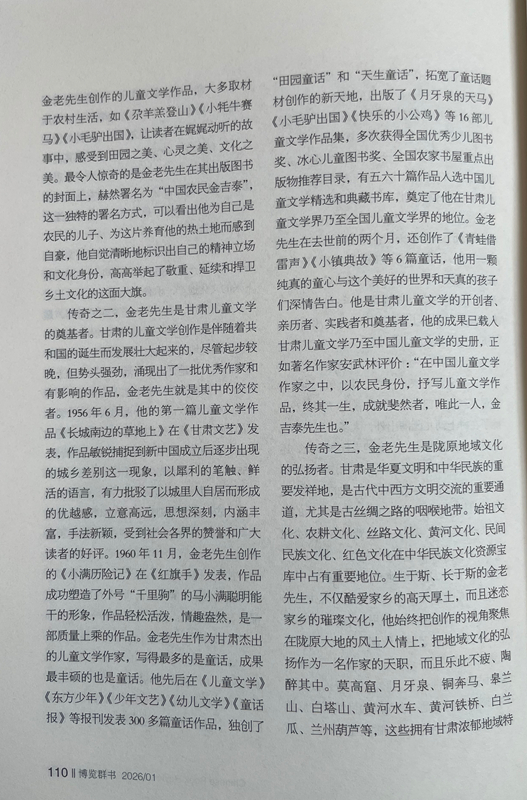 傳奇之二,金老先生是甘肅兒童文學(xué)的奠基者。甘肅的兒童文學(xué)創(chuàng)作是伴隨著共和國的誕生而發(fā)展壯大起來的,盡管起步較晚,但勢頭強(qiáng)勁,涌現(xiàn)出了一批優(yōu)秀作家和有影響的作品,金老先生就是其中的佼佼者。1956年6月,他的第一篇兒童文學(xué)作品《長城南邊的草地上》在《甘肅文藝》發(fā)表,作品敏銳捕捉到新中國成立后逐步出現(xiàn)的城鄉(xiāng)差別這一現(xiàn)象,以犀利的筆觸、鮮活的語言,有力批駁了以城里人自居而形成的優(yōu)越感,立意高遠(yuǎn),思想深刻,內(nèi)涵豐富,手法新穎,受到社會各界的贊譽(yù)和廣大讀者的好評。1960年11月,金老先生創(chuàng)作的《小滿歷險記》在《紅旗手》發(fā)表,作品成功塑造了外號“千里駒”的馬小滿聰明能干的形象,作品輕松活潑,情趣盎然,是一部質(zhì)量上乘的作品。金老先生作為甘肅杰出的兒童文學(xué)作家,寫得最多的是童話,成果最豐碩的也是童話。他先后在《兒童文學(xué)》《東方少年》《少年文藝》《幼兒文學(xué)》《童話報》等報刊發(fā)表300多篇童話作品,獨(dú)創(chuàng)了“田園童話”和“天生童話”,拓寬了童話題材創(chuàng)作的新天地,出版了《月牙泉的天馬》《小毛驢出國》《快樂的小公雞》等16部兒童文學(xué)作品集,多次獲得全國優(yōu)秀少兒圖書獎、冰心兒童圖書獎、全國農(nóng)家書屋重點(diǎn)出版物推薦目錄,有五六十篇作品入選中國兒童文學(xué)精選和典藏書庫,奠定了他在甘肅兒童文學(xué)界乃至全國兒童文學(xué)界的地位。金老先生在去世前的兩個月,還創(chuàng)作了《青蛙借雷聲》《小鎮(zhèn)典故》等6篇童話,他用一顆純真的童心與這個美好的世界和天真的孩子們深情告白。他是甘肅兒童文學(xué)的開創(chuàng)者、親歷者、實(shí)踐者和奠基者,他的成果已載入甘肅兒童文學(xué)乃至中國兒童文學(xué)的史冊,正如著名作家安武林評價:“在中國兒童文學(xué)作家之中,以農(nóng)民身份,抒寫兒童文學(xué)作品,終其一生,成就斐然者,唯此一人,金吉泰先生也。”