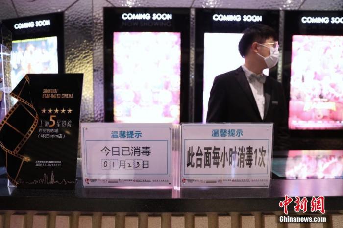 資料圖:1月23日,在上海影城、百麗宮等熱門(mén)影院前來(lái)購(gòu)票觀影的人數(shù)寥寥。圖為影院在醒目位置豎起“已消毒”標(biāo)牌。中新社記者 張亨偉 攝