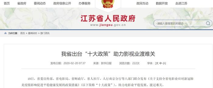 2月19日,江蘇省八部門聯(lián)合發(fā)布《關(guān)于支持全省電影業(yè)應(yīng)對(duì)新冠肺炎疫情影響促進(jìn)平穩(wěn)健康發(fā)展的政策措施》,即“影十條”,從落實(shí)稅收優(yōu)惠政策、加強(qiáng)財(cái)政支持力度、加大信貸投放、減免房租等十方面幫助電影業(yè)。